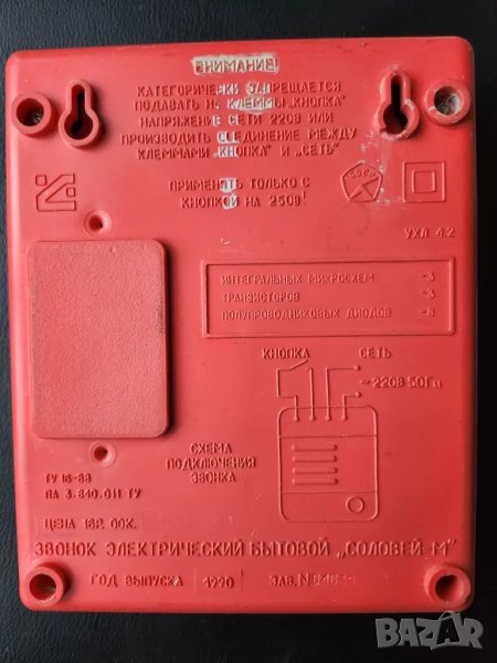 На гърба схема за свързване към мрежата и звънеца, знак на високо качество и цена: 16 рубли,произведен 1990 г.
