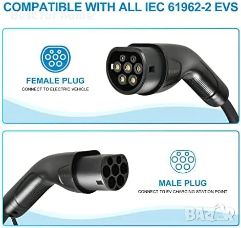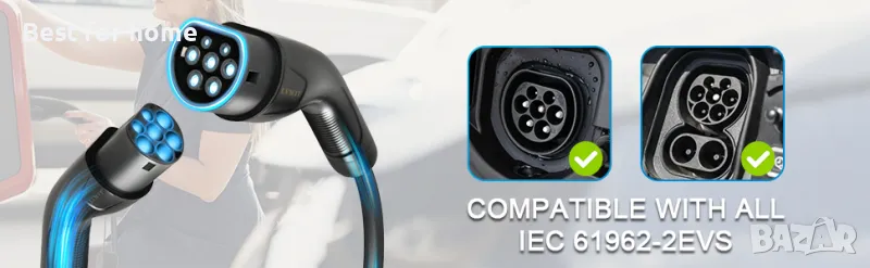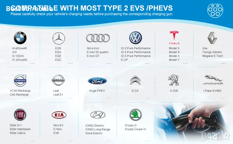Този кабел е предназначен за зареждане на EV превозни средства с вход тип 2 чрез европейска стандартна станция за зареждане с гнездо тип 2. Този продукт е подходящ за използване с електрически превозни средства с батерии (BEV) и хибридни електрически превозни средства (PHEV), които имат гнездо тип 2.