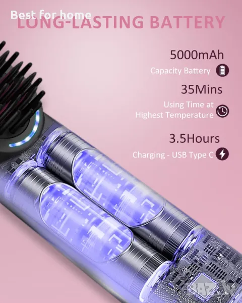 ПРОДЪЛЖЕНА УПОТРЕБА С ЕДНО ЗАРЕЖДАНЕ: Снабдена с мощна акумулаторна батерия от 5000 mAh и удобен кабел за зареждане USB Type-C, тази четка за изправяне предлага изключителна дълготрайност. Осигурявайки ви ненадминато удобство и ефективност.