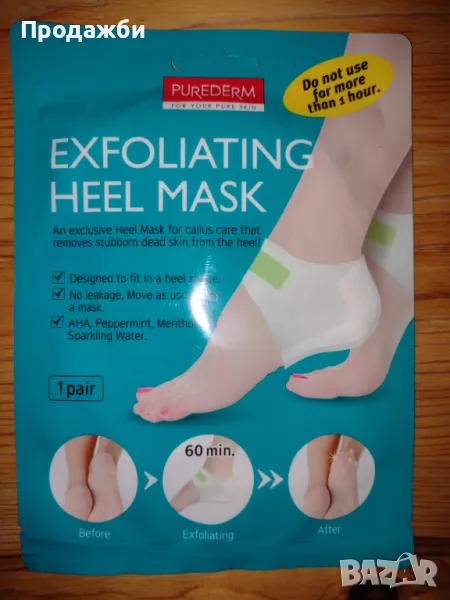 2. Маска за пети PUREDERM Exfoliating heel mask- ексфолираща маска за пети, която осигурява интензивна грижа за зоната на петата, като придава мекота. Маската осигурява пилинг за петите, премахва мъртвата кожа, мазоли и доставя необходимата влага. Хидратира и подхранва. Маската за пети осигурява тройна грижа, а именно ексфолира кожата, омекотява я и успокоява. Предимства: Омекотява. Пилинг ефект. Премахва мъртвата кожа и мазоли. Доставя влага. Хидратира. Подхранва. Ексфолира. Успокоява. 1 опаковка съдържа 1 чифт маски; запечатана опаковка;