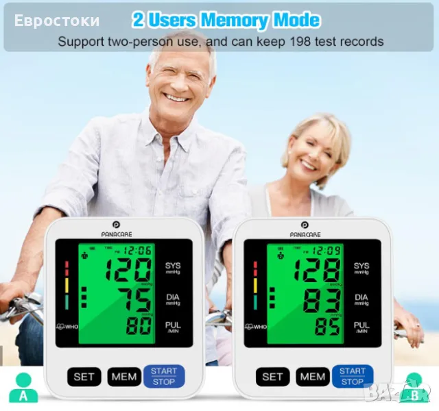 22-42 см голям маншет и 2 потребители. Маншетът е 22-42 см, подходящ за всички видове размери. Апаратът за кръвно налягане поддържа двама потребители с отделни записи. Устройството BP съхранява вашите показания (до 99 записа на потребител), както и дата и час.