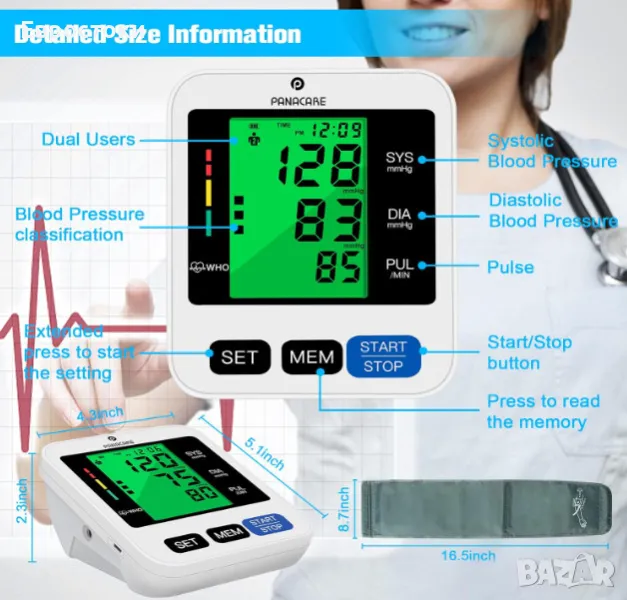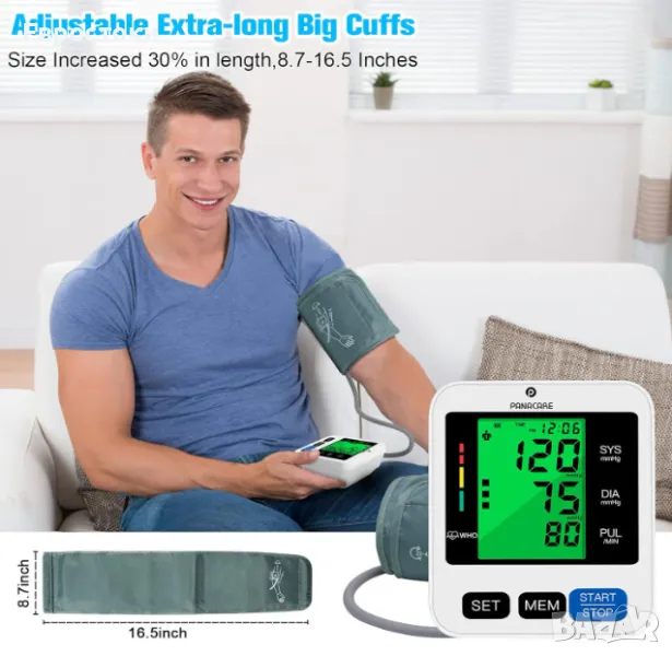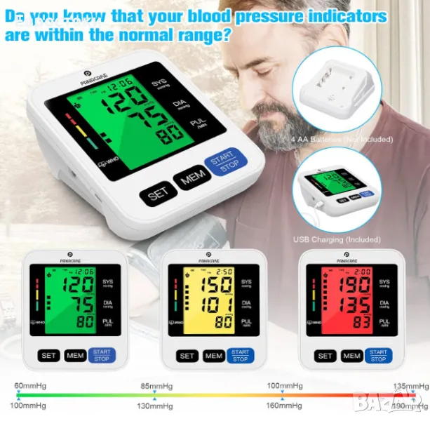 Автоматичен апарат за измерване на кръвно налягане PANACARE BSX516, 3-цветен дисплей с подсветка