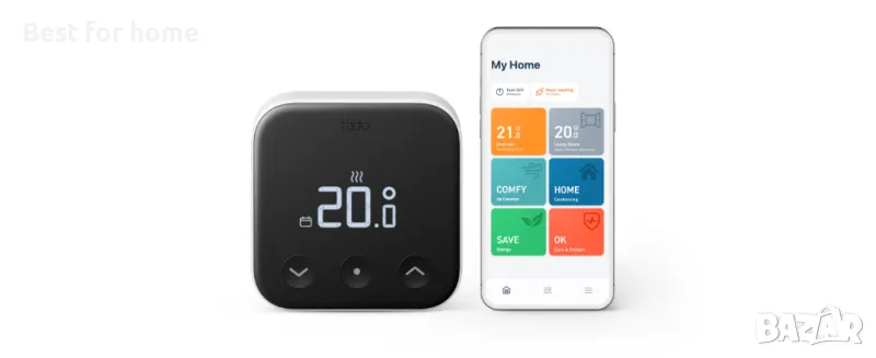 Никой вкъщи или просто се прибират? Auto-Assist регулира температурата автоматично. Ако използвате tado° за отопление, Care & Protect ви помага сами да решите проблемите с вашата система. Energy IQ ви информира подробно за консумацията на енергия и разходите. Auto-Assist може да се резервира в приложението и може да се отмени по всяко време (2,99 паунда/месец, 24,99 паунда/година). – Допълнителен продукт за интелигентни радиаторни термостати X, за оптимален контрол на отоплението, спестяване на енергия и разходи, лесна инсталация „Направи си сам“, не е съвместим с tado° V3+