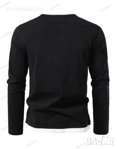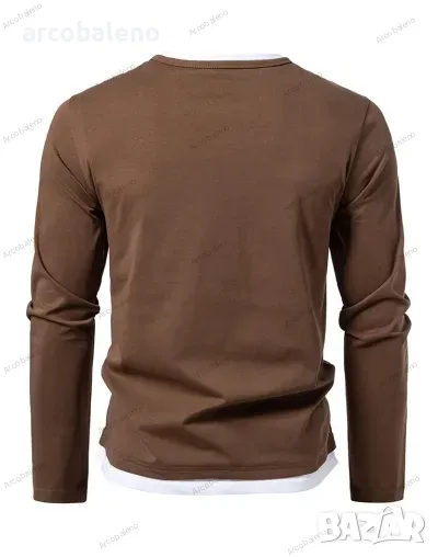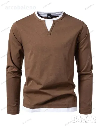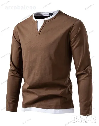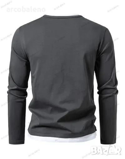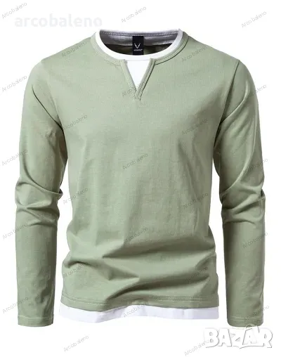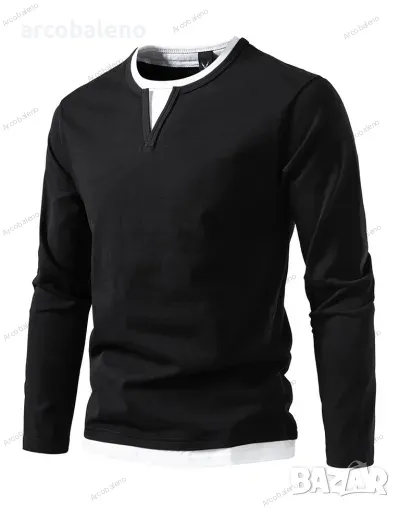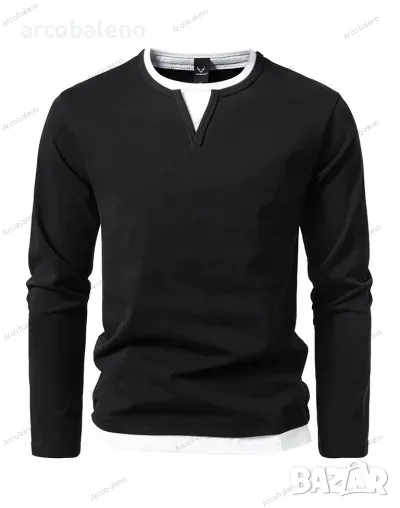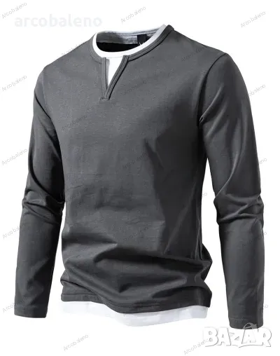 Фалшива двуслойнa мъжка тениска с V-образно деколте и шевове. Мъжка тениска с дълги ръкави