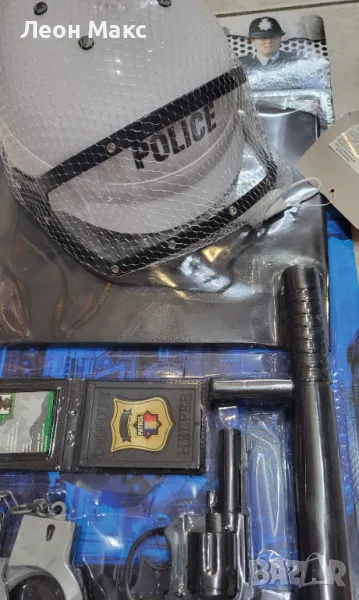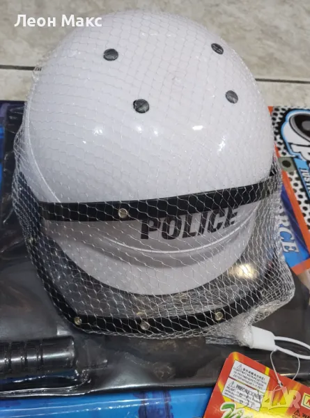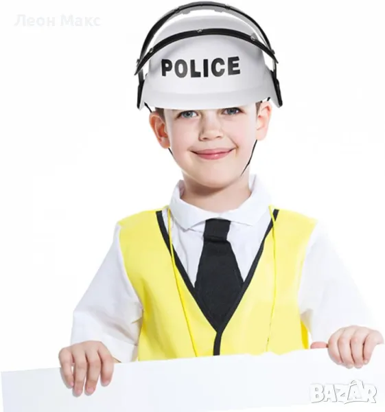 Полицейска каска. Това е декоративна и реалистична полицейска шапка, предназначена за деца (за парти), произведена от устойчива на износване пластмасова материя.
