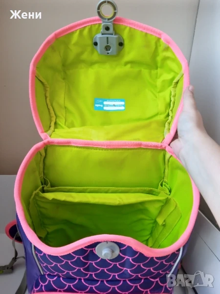 Раницата е оригинална, качествена, в много добро/отлично състояние. Регулира се спрямо височината на детето. Цветовете са по-ярки, отколкото на снимките. Има леки зацапвания отвътре.