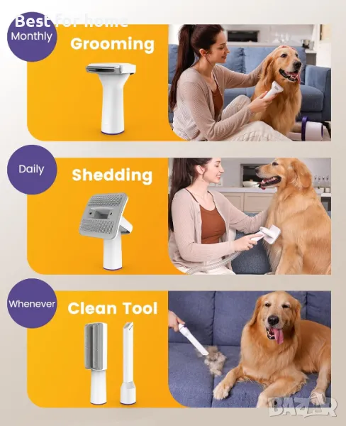 Лесно премахване на разпуснатата козина: Нашата прахосмукачка за подстригване на домашни любимци, специално проектирана за огромни косми и гъста двойна козина. Модернизираният уникален Grooming Bursh с Safe Mteal Point върши добра работа за премахване на разпуснатите косми и подкосъм в сравнение с други. Нашият е по-ефективен за премахване на подкосъм. Имаше 99% от косата, която се отдели. Прави по-малко косми да се носят из дома ви