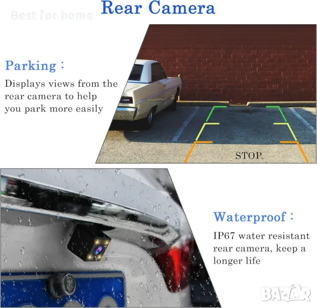 【Система за наблюдение на заден ход】 : Оборудван с водоустойчива задна камера, осигурява изглед отзад, който се активира при включване на задна предавка. Ще покаже насочващата линия за паркиране, може да насочи шофьорите към защитени зони за паркиране.