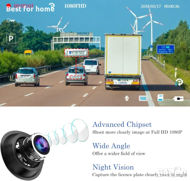 Взема усъвършенстван чипсет, базиран на предна камера с Full HD 1080P под див ъгъл и задна камера с 4 LED светлини с Full HD 480P, които осигуряват кристално чисто изображение и страхотно рязко качество на видео дори през нощта.