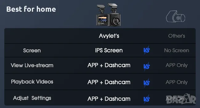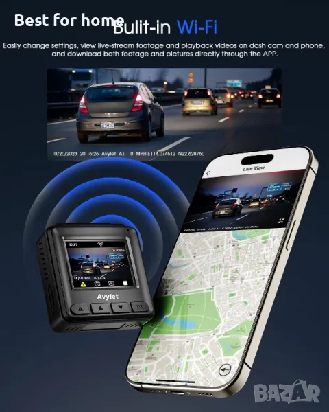 Вграден Wi-Fi и APP контрол. Автомобилен видеорегистратор с приложението Avylet ви позволява да променяте настройките, да гледате видеоклипове в реално време и да възпроизвеждате записан материал на вашия смартфон. Можете също така да споделяте видеоклипове и снимки чрез платформи за социални медии или приложения за съобщения, без да се налага да изтегляте данни. Включете WiFi на камерата за управление, върнете се в режим на преглед, за да запазите настройките и да избегнете проблеми с намирането на телефона си.