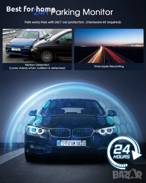 Мониторинг на паркиране. Засичане на движение: когато се засече движение в зрителното поле на камерата, записът започва. Изтичане на времето: когато автомобилът е паркиран, камерата записва непрекъснато с персонализирана честота на кадрите (напр. 1/2/5/10 кадъра в секунда). Важна забележка: за да активирате режима на паркиране, ще ви е необходим комплект фиксирани кабели.