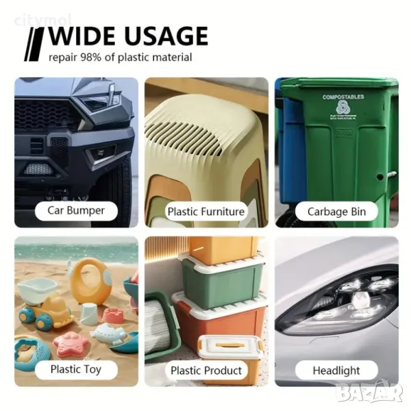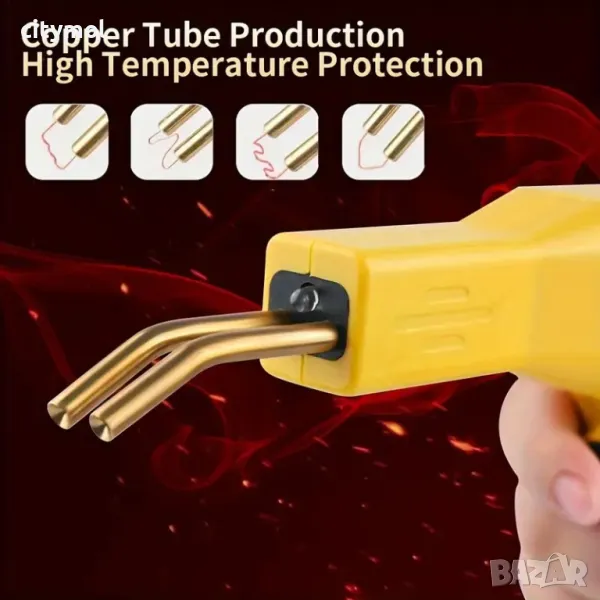 Пистолет за лепене на пластмаса. Комплектът включва 200 стоманени скоби за пластмаса (4 вида по 50 броя), макетно ножче и клещи за рязане на скобите. Отличен комплект за ремонт на пластмасови части, заваряване на пластмаси и маскиране на всякакви пукнатини. Комплекта е в удобно куфарче, който ще улесни пренасянето и съхранението на всички елементи.