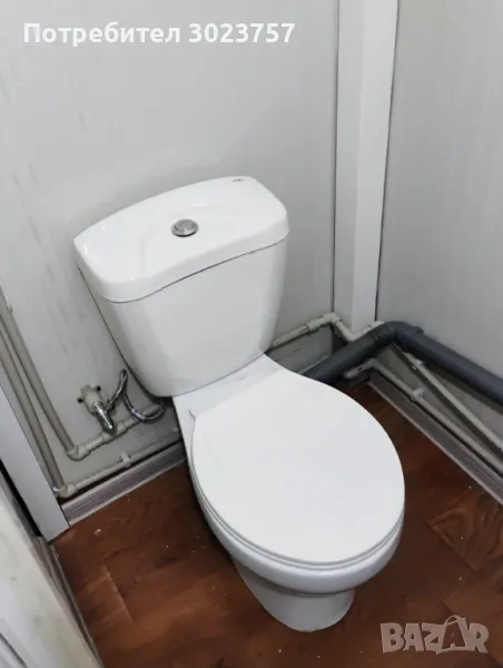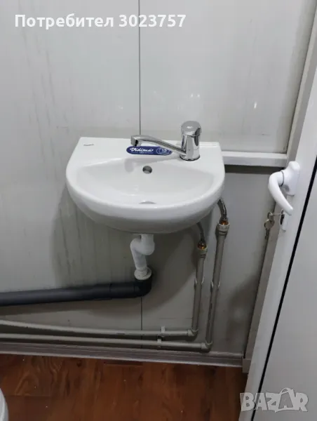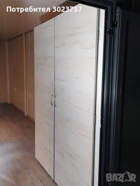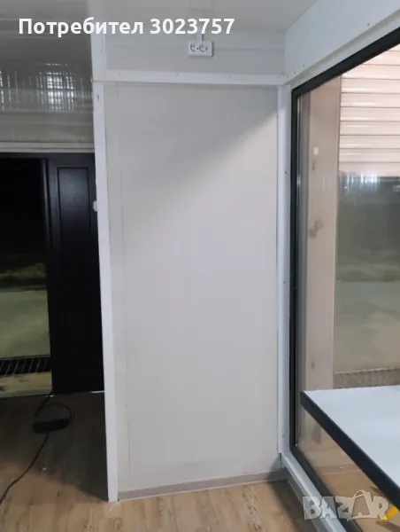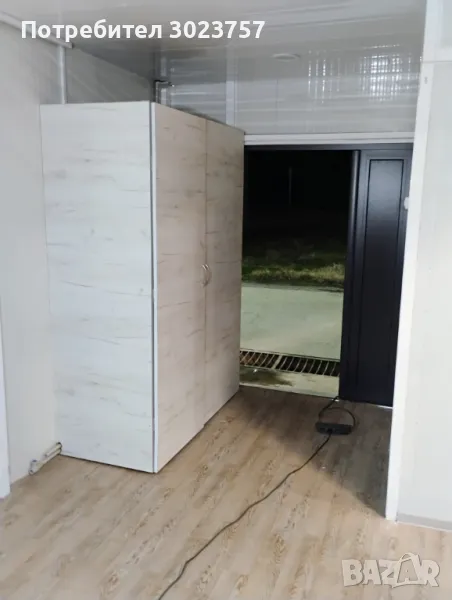 рифелова ламарина 4мм в мястото където ще стои печката, Има вградена тоалетна и складово помещение.Вратата е дкукрила с р-ри:2х1.20м