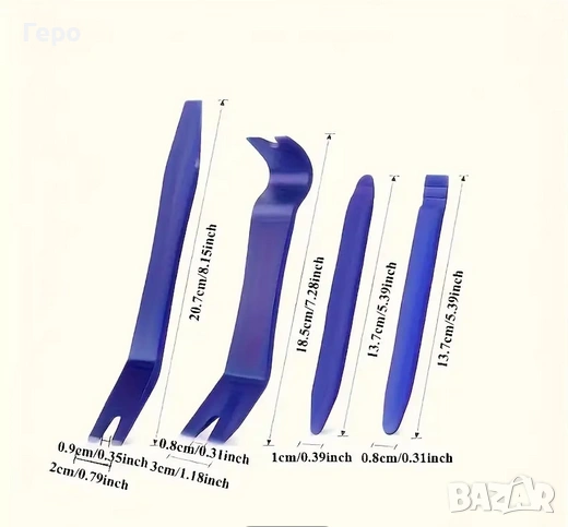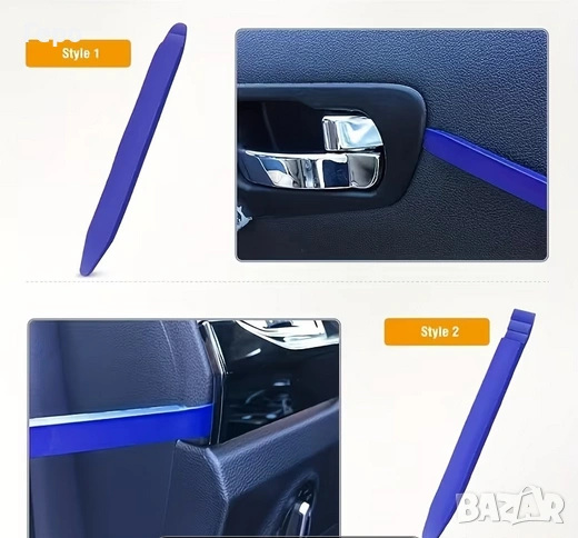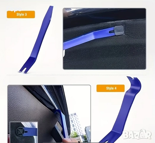 Нов пластмасов комплект от 4 броя инструменти - щанги за демонтаж на интериорни елементи на автомобилното табло, централната конзола, аудио, премахване на панел на врата и вътрешна облицовка, вадене на щипки от кори на вратите, подкалниците, лайсните и др. без нараняване и надраскване. Изпращам с преглед, лично предаване.