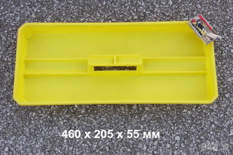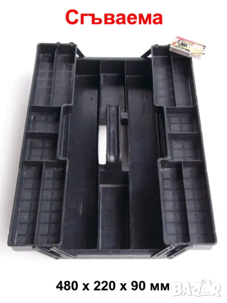 Многофункционална тава тип касетка поставка с отделения с прегради и дръжка, с голям капацитет за съхранение и транспортиране на инструменти - гаечни звезди лули ключове за джанти гуми, раздвижен френски и тръбен ключ, тресчотки върток вложки гедоре, клещи, отвертки, щанги, пробои секачи длета, чук, пили, свредла бургии, ролетка, принадлежности аксесоари и консумативи, рибарски ловни такъми и др.