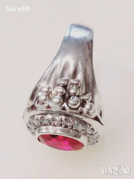 Продавам прекрасен майсторски сребърен пръстен с инкрустиран рубин и циркони.сребро 925 проба.