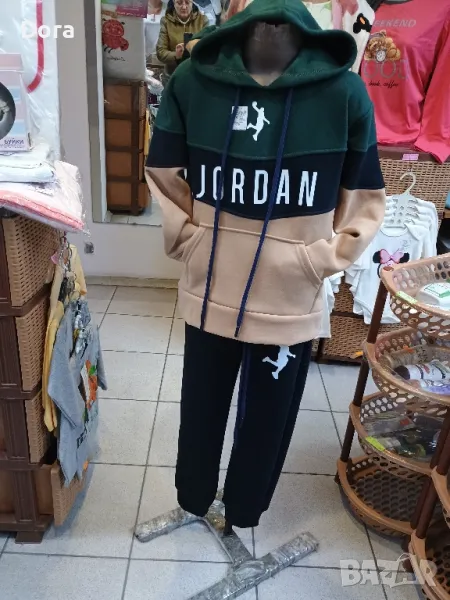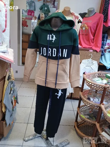 Детско -юношески компл.от 7г.до 16г.триконечна вата,с качулка и 2 джоба на горницата .Горницата се състои от т.зелена част с качулката, и щампа баскетболист,малка черна лента на която е надписа, jordan ,и бежаво част с джобовете .Долницата черна с 2 джоба и щампа на единия крачол баскетболист.Долу на глезена има ластичен коректор.Може да откриете във Варна ул.Др.Пискюлиев ном.6.Заповядайте.