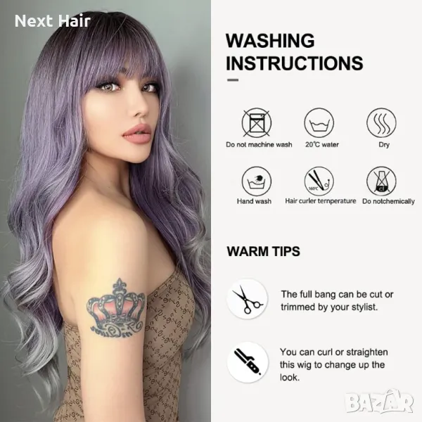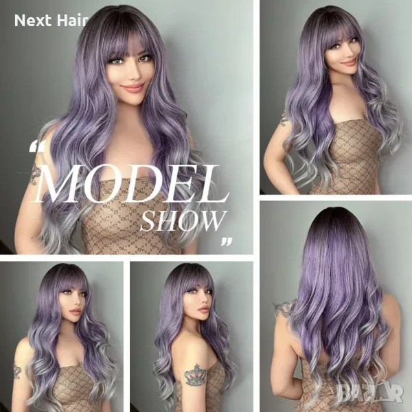 Омбре перука три цвята кафяво-лилаво-сиво с бретон → Обява 48464814