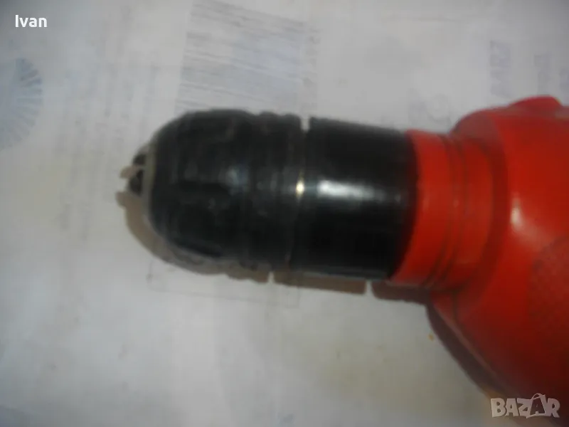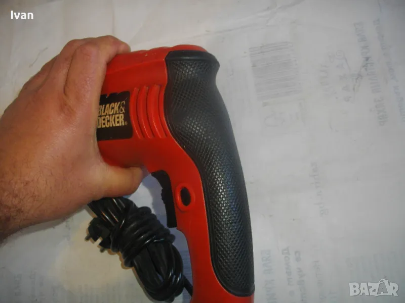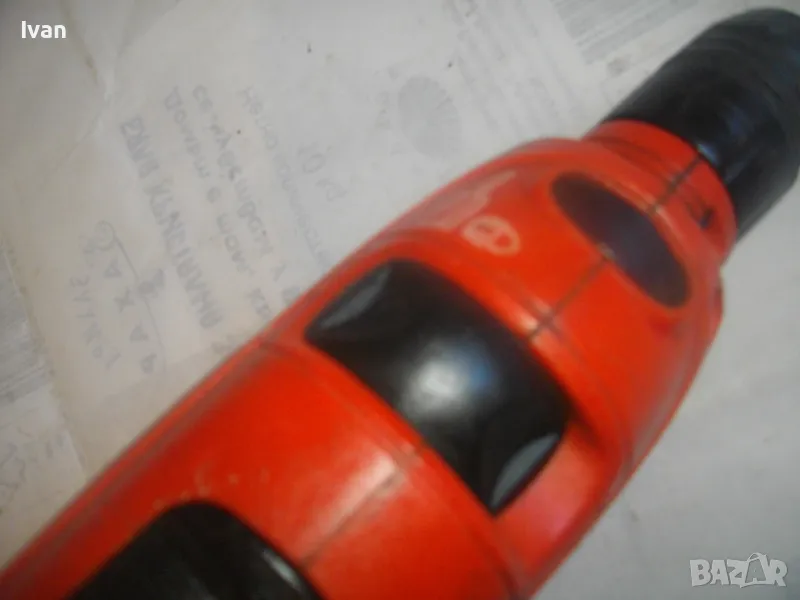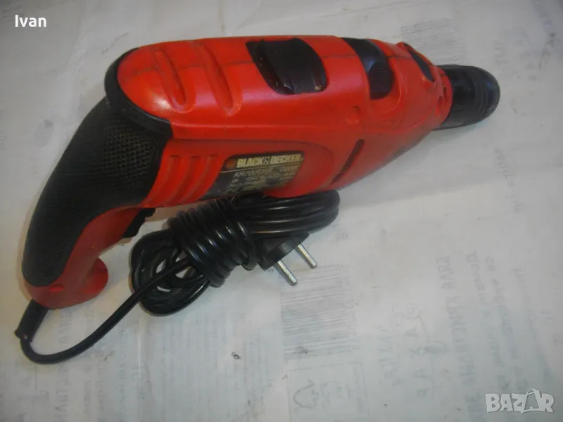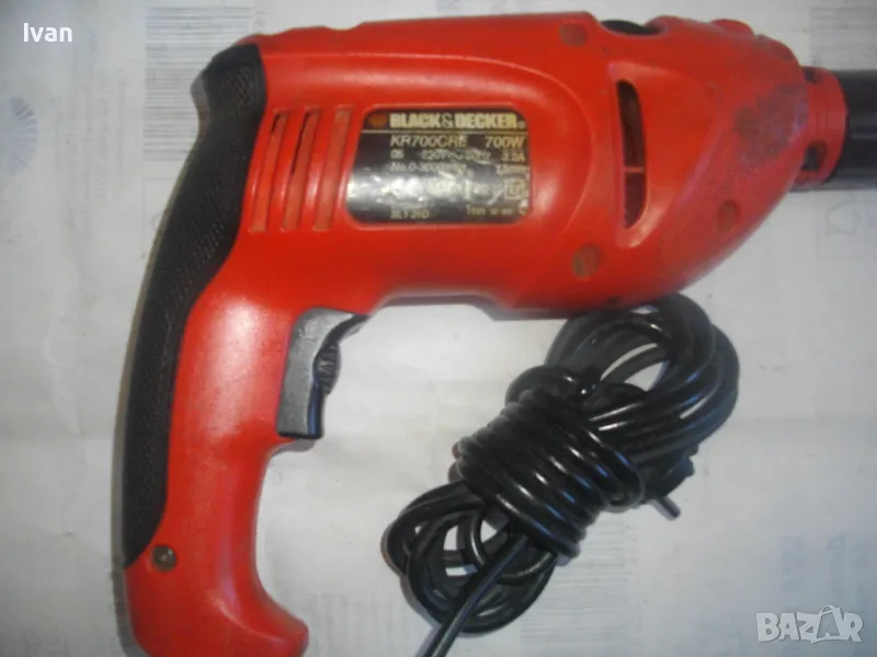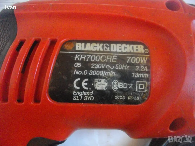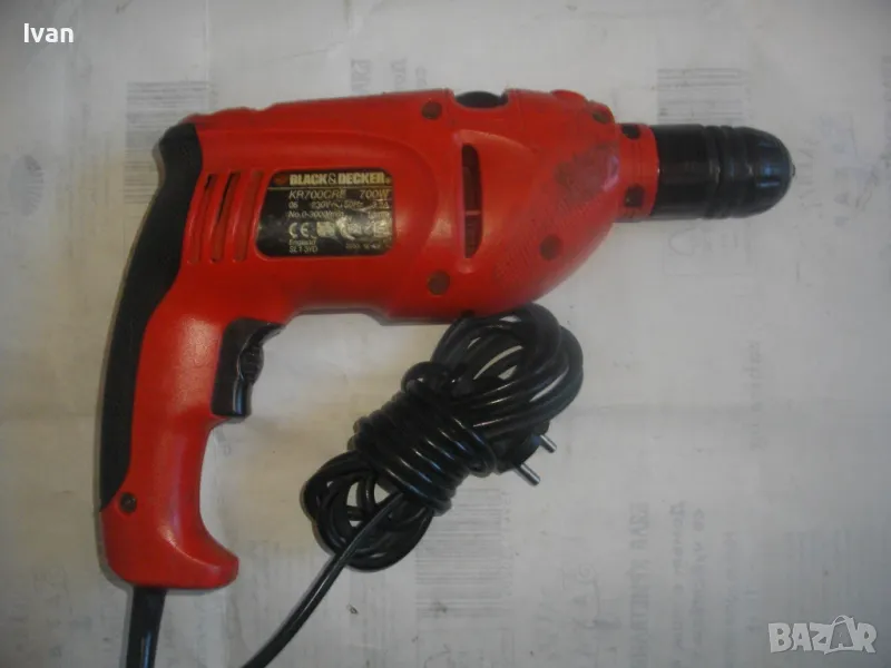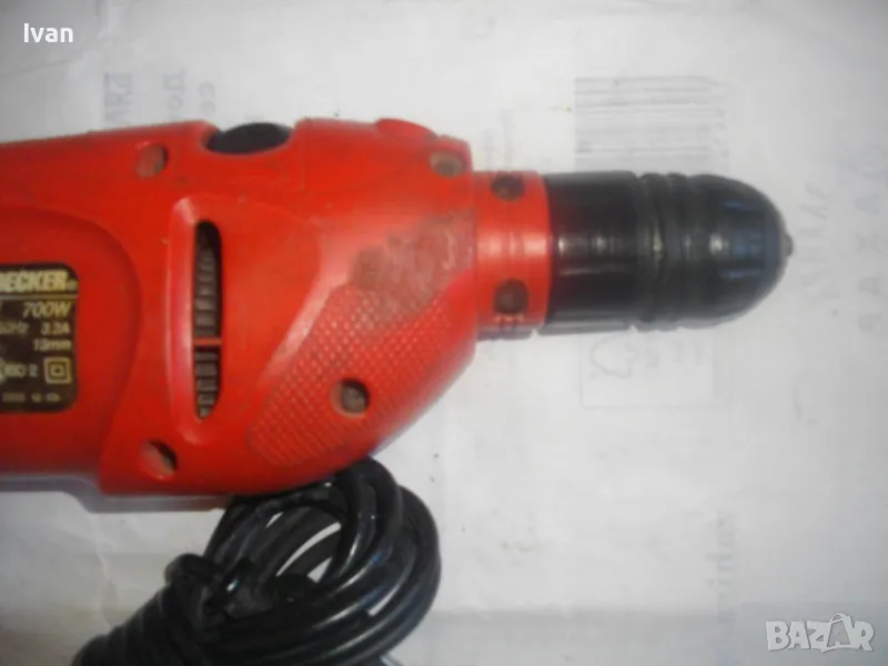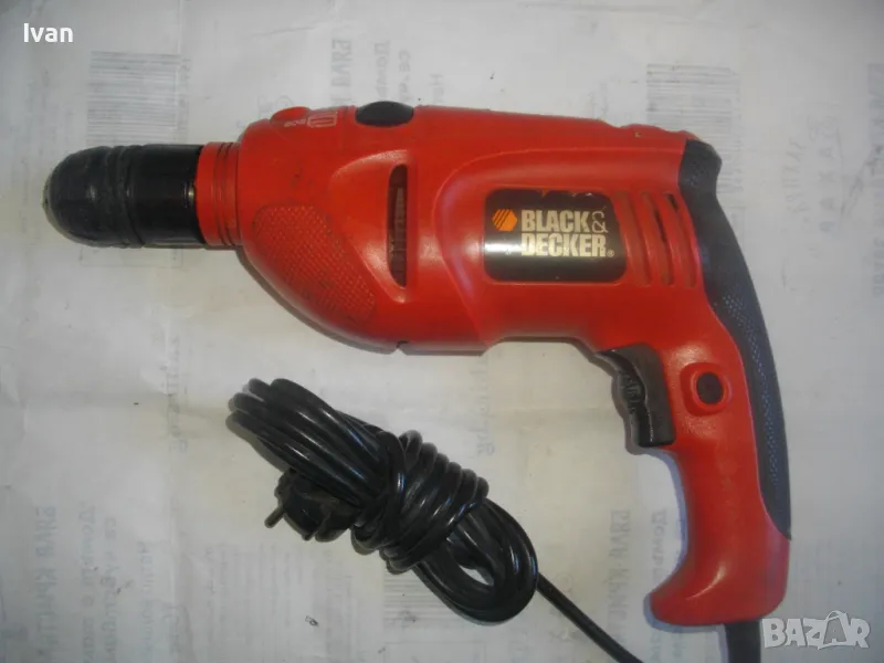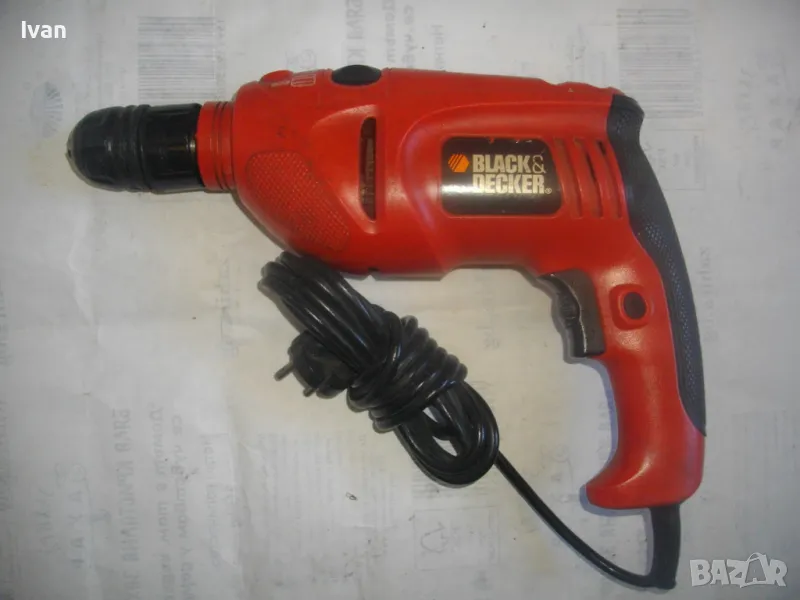 Цена 99 лв. Ударна английска дрелка,модел на Бек Декер.Запазен външен вид и работи много добре.Силна,мощна.Мощност-710 вата,обороти-от 0 до 3000,регулируеми от спусъка.3,2 ампера.Реверс смяна посока.Функция пробиване и пробиване с удар-символ чук.Гумирано нехлъзгащо се покритие на задната дръжка.Голям самонатягащ се патронник-до 13 мм.