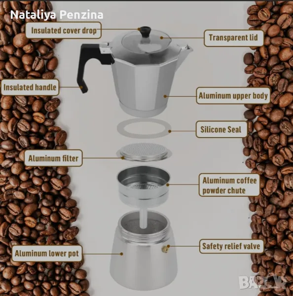 Чисто нова. Класическа италианска кафеварка: Изработена от хранителен алуминий в ярък цвят. Нагрява равномерно за наситено кафе с пълно тяло. - Изтънчен дизайн: Прозрачният капак ви позволява лесно да видите какво се случва вътре в кафеварката. Модел с мека на допир бакелитна дръжка и копче, което позволява сигурен захват -Удобно отопление: Подходящо за всички отоплителни системи с изключение на индукционни, може да се нагрява на газ, керамични котлони и др. -Голям капацитет: С капацитет от 14 чаши (700 мл), можете да споделяте вкусно кафе със семейството и приятелите си. -Лесна за използване: Кафемашината има стабилна конструкция с предпазен клапан и се почиства лесно.