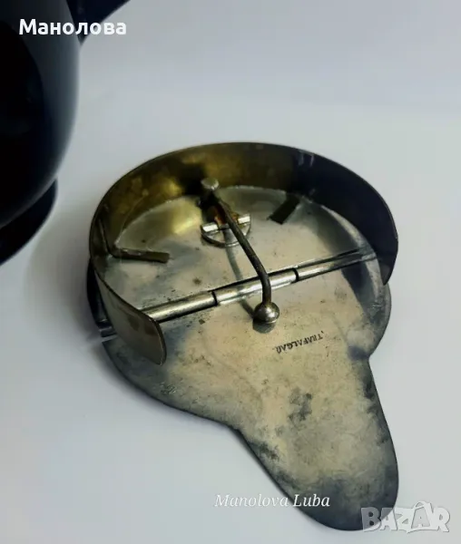 В добър антикварен вид, каната за мляко е с калаен подвижен капак. Калаеният капак има малък лост за палеца, за да отвори част от горната част. Долната страна на капака е щампована TRAFALGAR. Общото състояние е добро, имайки предвид възрастта и. Моля разгледайте снимките! Пукнатина в горната част, която е само от външната страна. Има и леки драскотини по самото тяло на каната.