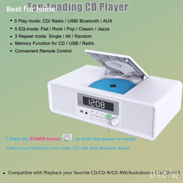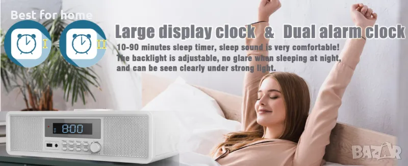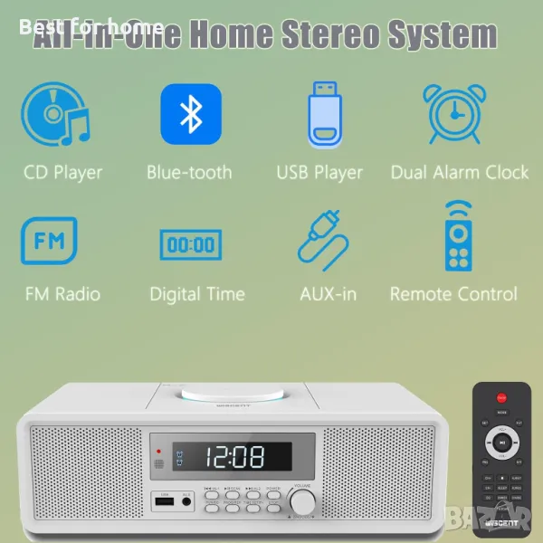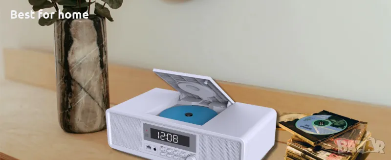 Домашна стерео система, компактен CD плейър с Bluetooth, двоен будилник, USB, FM радио, AUX, изход за слушалки, дрямка и таймер, първокласна 20 W RMS звукова система, CD плейъри за дома