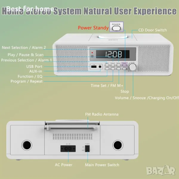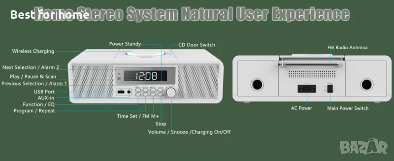 стерео система, 20 W RMS аудио система, компактен CD плейър с Bluetooth, двоен будилник, USB, FM радио, AUX, дрямка и таймер, CD плейъри за дома