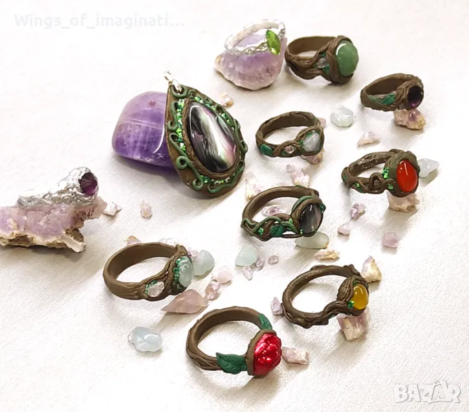 Нови авторски фентъзи/горски/елфски пръстени и медальон от полимерна глина с естествени камъни и кристали: ахат, аметист, аквамарин, авантюрин.