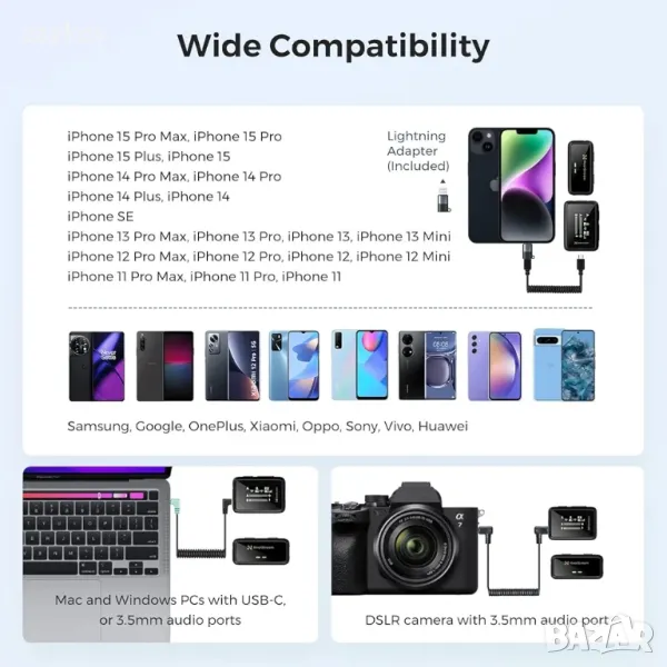 Plug and Play: Lavalier микрофон USB-C не изисква допълнителни драйвери. Просто включете приемника в устройството си, включете предавателя и те се свързват бързо.