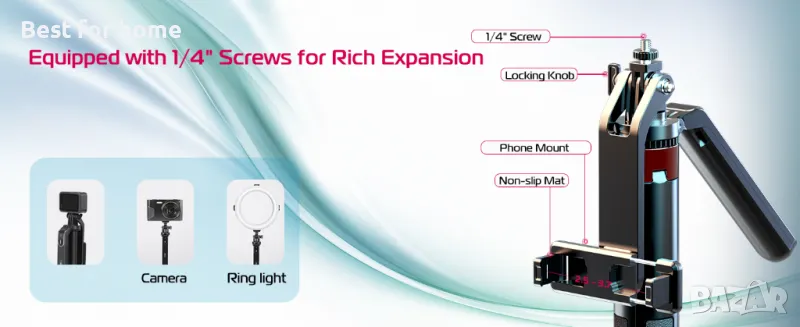 ▶【Универсален статив за телефон, камера и екшън камера с интегриран дизайн 3 в 1】 С подобрен и интегриран дизайн, стативът MA09 се разширява при използване на други смарт устройства, различни от телефон. Регулируемата щипка в горната част може да се разшири до универсална щипка за телефон до 2,5"-3,7"/65-95 мм, която е съвместима с повечето смартфони и може да се прикрепи към камера за съхранение чрез 1/4" винтова резба