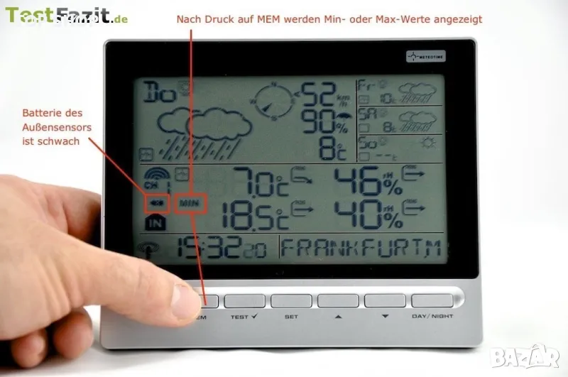 Въпреки доста компактния си размер, Conrad Meteotime е пълен с много функции. Например станцията предлага прогноза за времето за следващите четири дни. Този протокол за изпитване изяснява колко точна е прогнозата и показаната температура. Забележка: Метеорологичната станция беше любезно предоставена от Conrad.de в продължение на шест седмици за този тест.