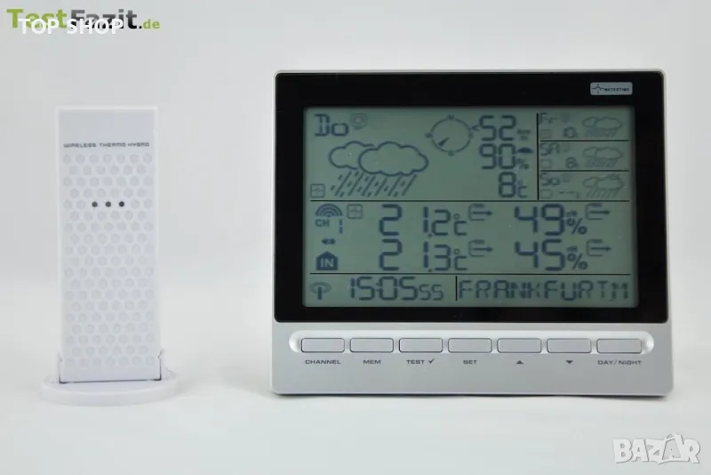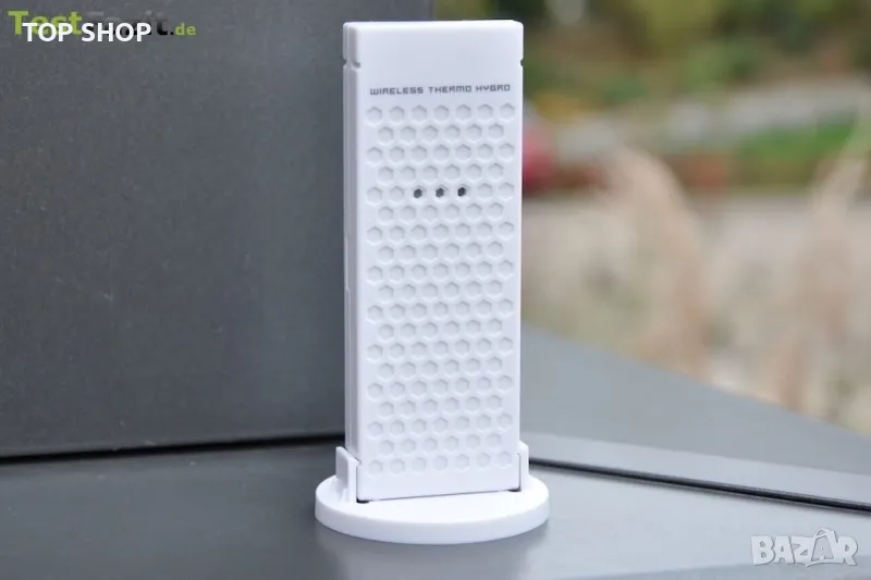 Външният сензор е идентичен със сензора на Hama EWS-165. Корпусът на сензора се състои от светлосива проста пластмаса. Когато закрепвате външния сензор, трябва да изберете място, устойчиво на атмосферни влияния. По-специално влагата значително намалява експлоатационния живот на външните сензори. Външният предавател е от доста прост характер и освен че обработва действителната метеорологична станция, изостава донякъде. За съжаление предавателят нямаше собствен дисплей. Температурата може да се отчита само на базовата станция, така че проверката на функциите не е толкова лесна.
