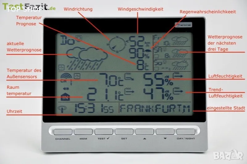 Разположението на стойностите за времето на дисплея е съвсем логично. В горната част са стойностите на прогнозата за времето. В допълнение към пиктограма за слънчево, облачно или дъжд, вероятността за дъжд в проценти, скорост и посока на вятъра, както и температурата също могат да бъдат намерени тук. Символите за текущата прогноза са доста големи, докато прогнозата за следващите три дни е доста малка. За съжаление нямаше осветление на дисплея.