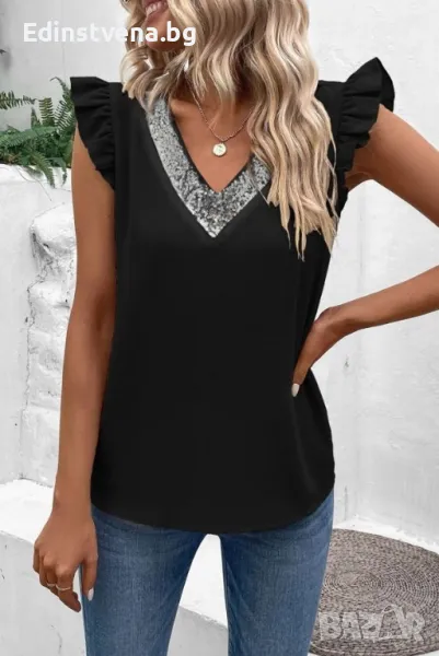 Дамска блуза в черно с V-образно деколте с пайети и къдрички при ръкавите → Обява 48470222