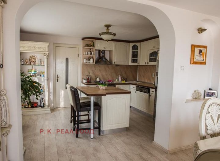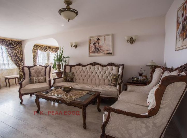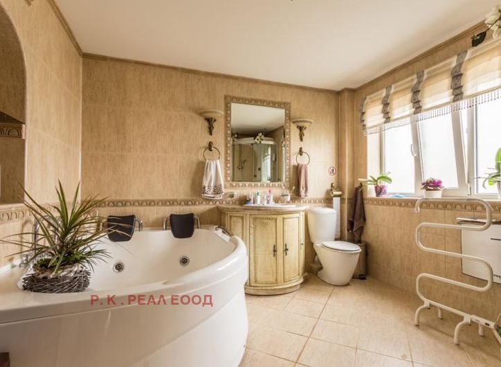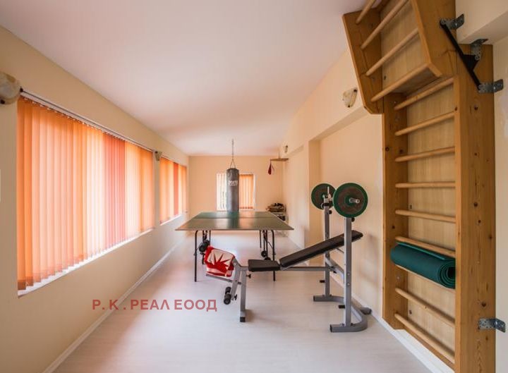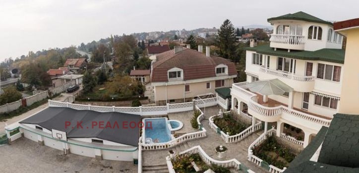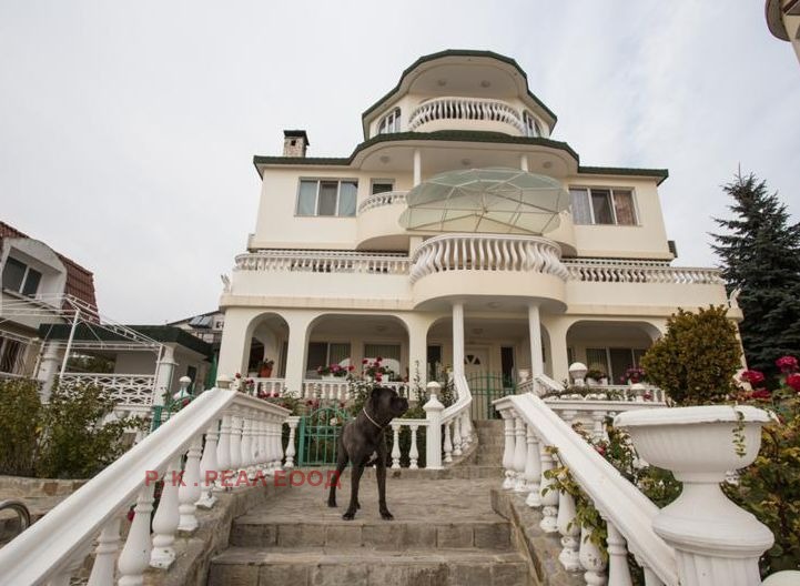 РЗП-500кв.м Дворно място-750кв.м Гаражи-4 Преден двор -басейн 6-3м с джакузи, зона с шатра и тоалена с душ. Цветна градина с поливна с-ма и шадраван с осветление с рози и вечнозелени храсти. Зона с барбекю. Заден двор с поливна с-ма и овошки.