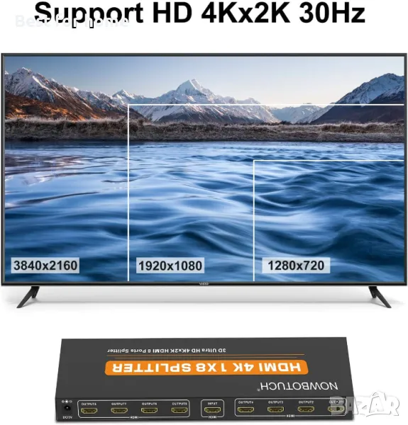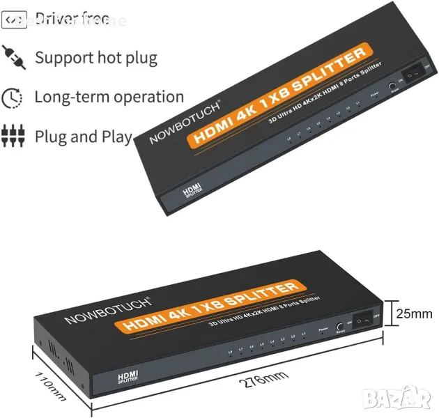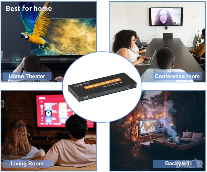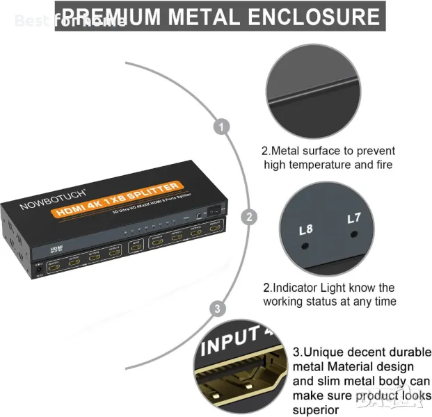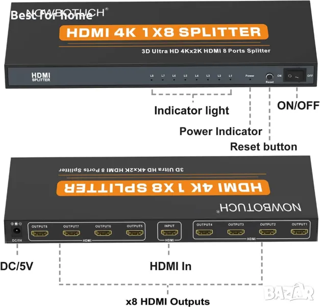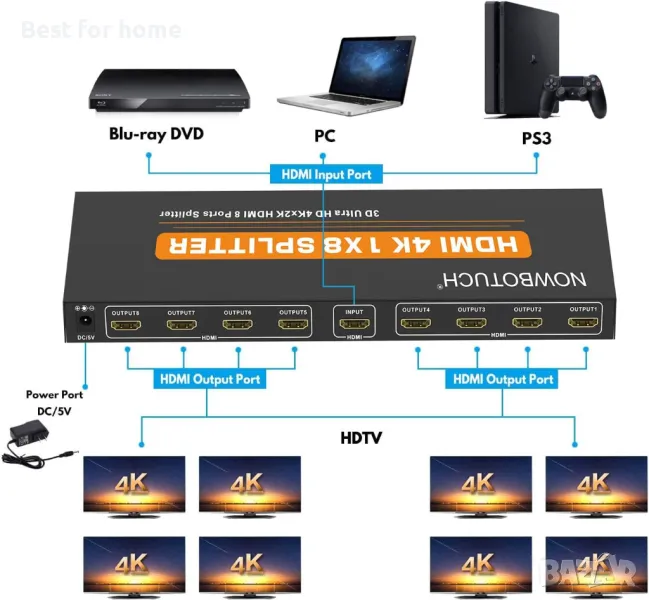 8-посочен HDMI сплитер NOWBOTUCH Разделя един HDMI входен сигнал на осем HDMI изходни сигнала, идентични на входния сигнал, без загуба на качество. 1 входен източник като blue ray плейър може да показва на 8 източника на 8 телевизора.