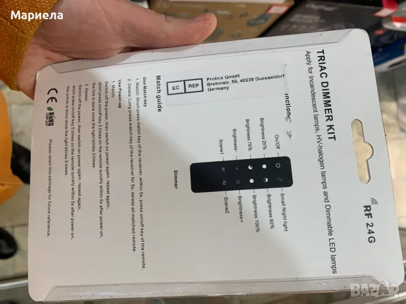 Комплектът AC Triac RF димер включва едно RF дистанционно R1 и един Traci димер S1-B. S1-B е иновативен AC димер с фазово изрязване с RF контрол и функция за натискане на дим. AC триак димерът е проектиран с 100-240VAC широк вход и изход, 1 канален изход, както триак димируем, така и mosfet димируем. Съвместим е с различни едноцветни дистанционни управления от серия RF. Функцията за затъмняване чрез натискане е налична, докато димерът е свързан с превключвател.