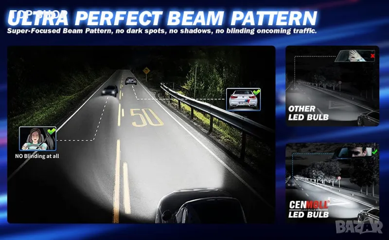 【Перфектен модел на лъча】 Централната точка на осветяване на LED чиповете на крушката h4 е в съответствие с халогенната лампа, ултра тънкият интервал на чипа осигурява супер фокусиран светлинен лъч, решава проблема с неравномерното фокусиране, дизайнът на халогенния лъч 1:1 осигурява перфектен модел на лъча. Светодиодната крушка за фарове CENMOLL h4 не заслепява насрещния трафик и няма отблясъци за други шофьори, тъмни петна или сенчести зони.
