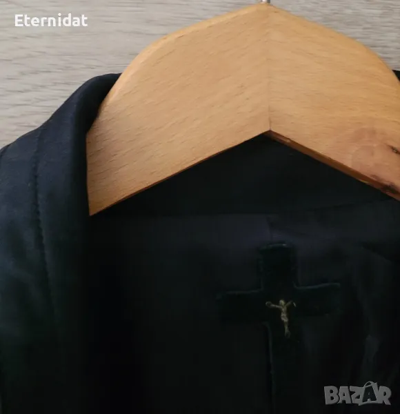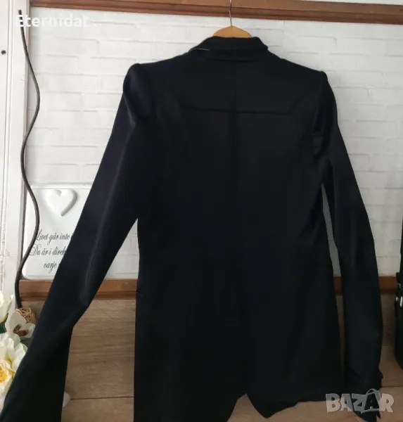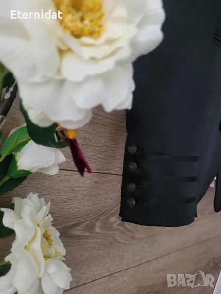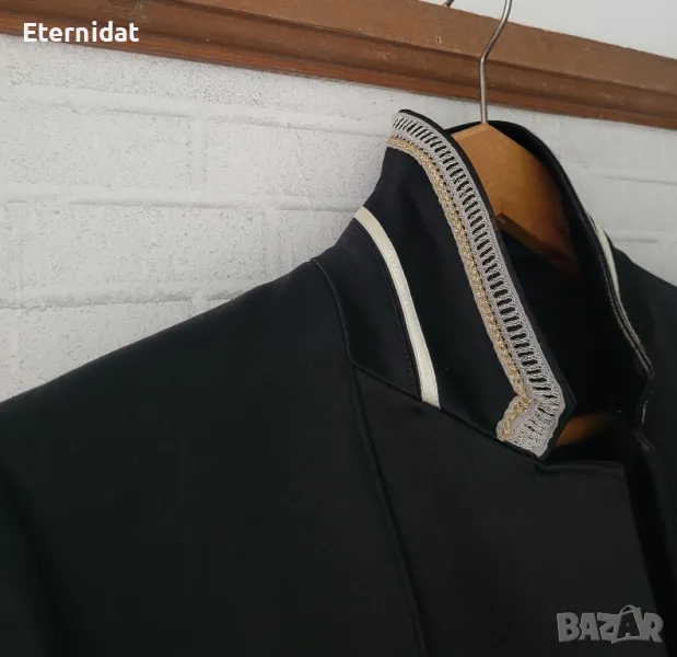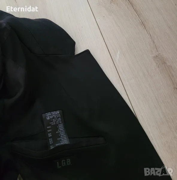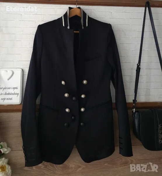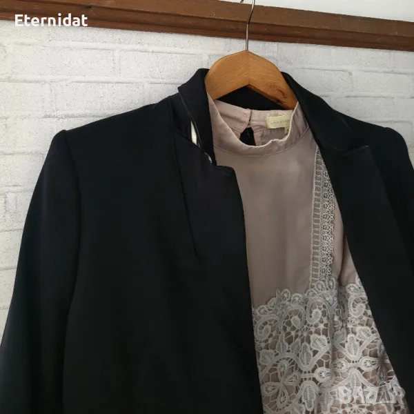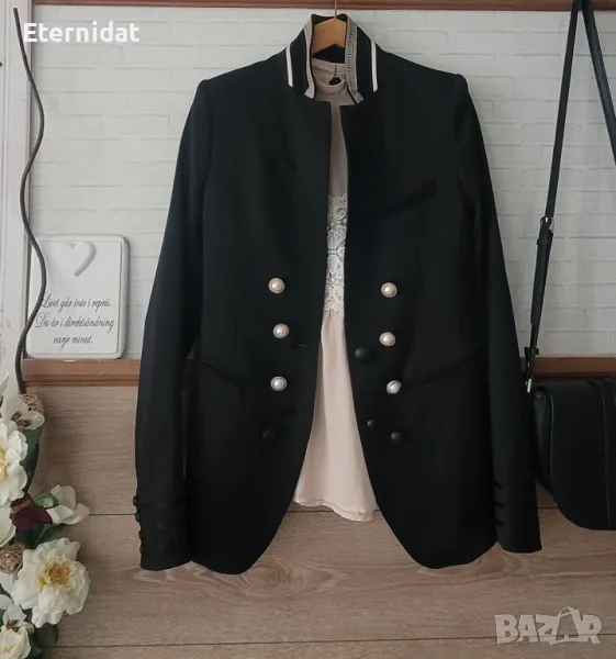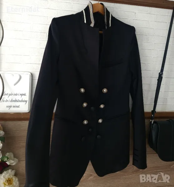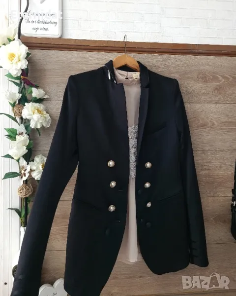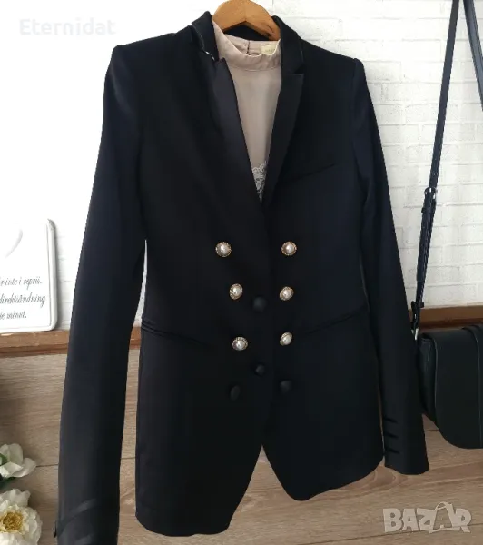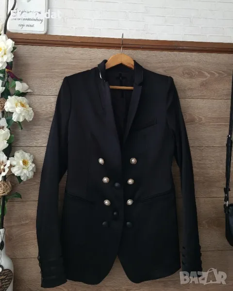 Висок клас черно сако LCD. Красиви копчета в предната част тип перли, яката е обшита със златиста нишка. Вътрешен джоб, хастар. Отвътре инкрустиран детайл от естествена кожа ( кръст).Стил, качество, дизайн!!!Уникална материя с леко лъскава наподобяваща плътен сатен. ( район, купро, полиестер). Има лека еластичност. Размер S/M.