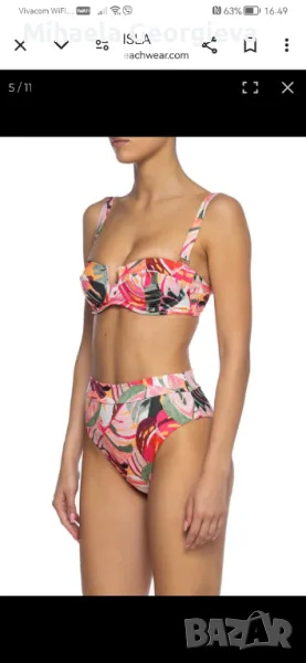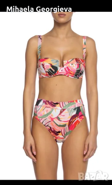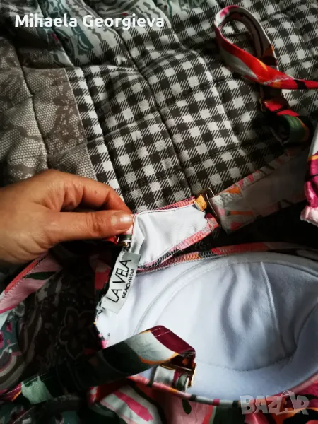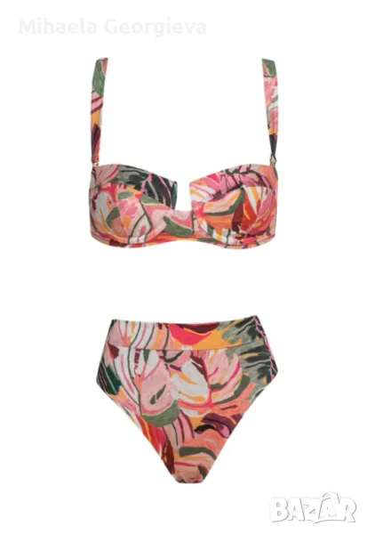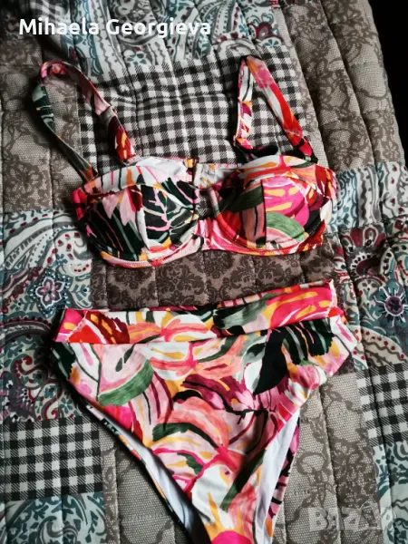Банският е носен само веднъж и горната част ми е малка. Горна част размер М, но по скоро отговаря на S, обиколка 85 см. Долната част е с дълбока талия и е размер М, обиколка талия 65 см, дължина на цялото долнище 28 см. Плата е плътен и разтеглив, прибира корема.