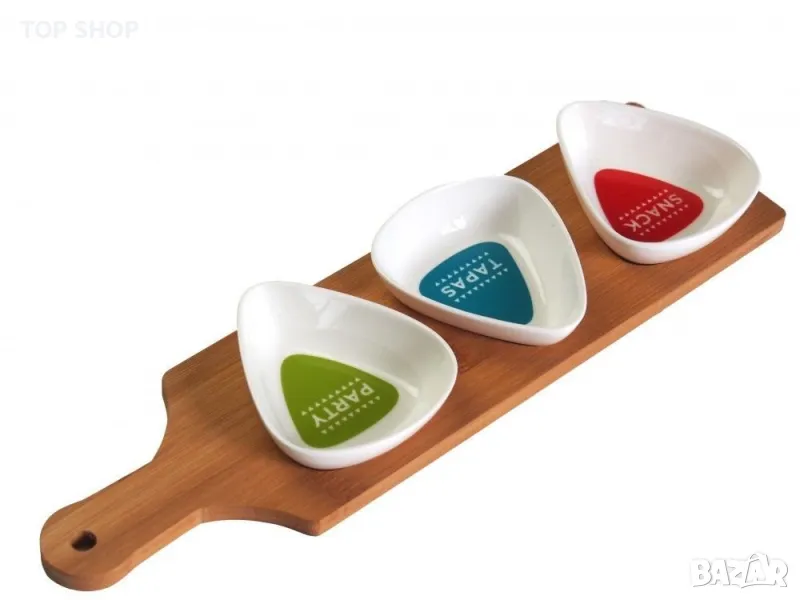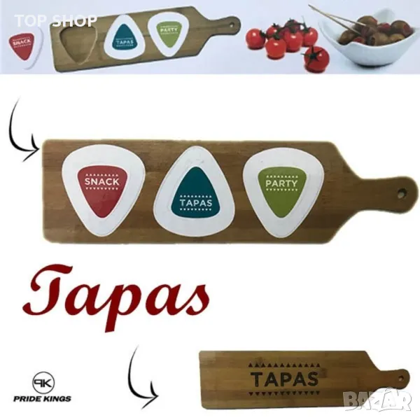 - дъска поднос с размери 37 * 10 см. В долната част на дъската е отпечатано с топъл печат атрактивен надпис "TAPAS". В основата на дъската поднос са формирани 3 отвора за поставяне на чинийките.