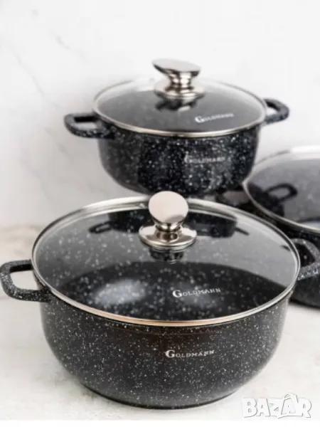 Материал: Лят алуминий с мраморно покритие;Цвят: Черен;Съвместимост: Индукция, газови, електрически и стъклокерамични котлони;Размери и вместимост: Тенджера с обем 2,3 литра, диаметър 20 см, височина 8,5 см + стъклен капак, Тенджера с обем 4,5 литра, диаметър 24 см, височина 11,5 см + стъклен капак, Тенджера с обем 6,5 литра, диаметър 28 см, височина 12,5 см + стъклен капак.