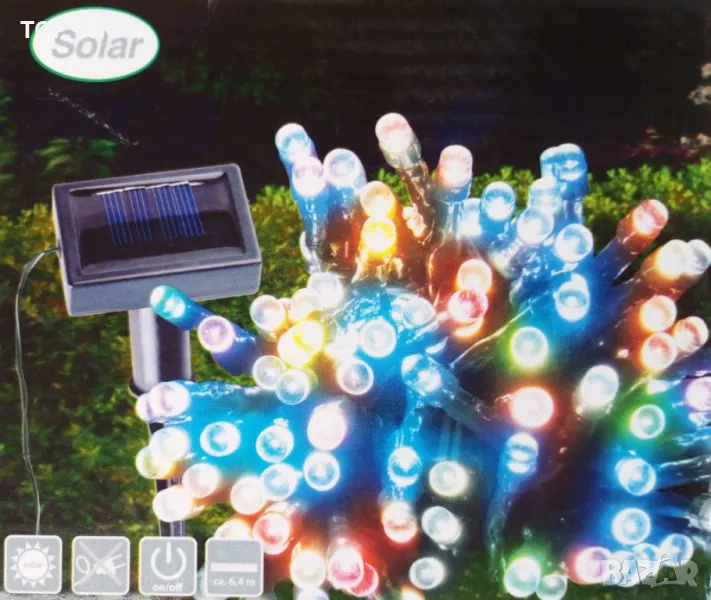 Диодни лампички със соларно заряндно. Без необходимост от батерии и външно захранване. Соларното зарядно зарежда лампичките през деня. При стъмняване те светват автоматична. Могат да се вкл/ изкл и с бутон.