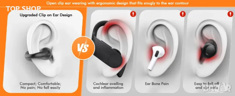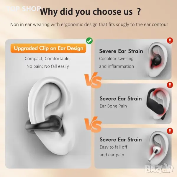 [Истински слушалки с отворено ухо] Безжичните слушалки имат напълно отворен дизайн, накрайниците могат да бъдат внимателно и стабилно поставени в горната част на ухото. Слушалките с отворено ухо обикновено са по-леки и по-дишащи от слушалките за поставяне в ушите, което ги прави по-удобни за носене за продължителни периоди от време.