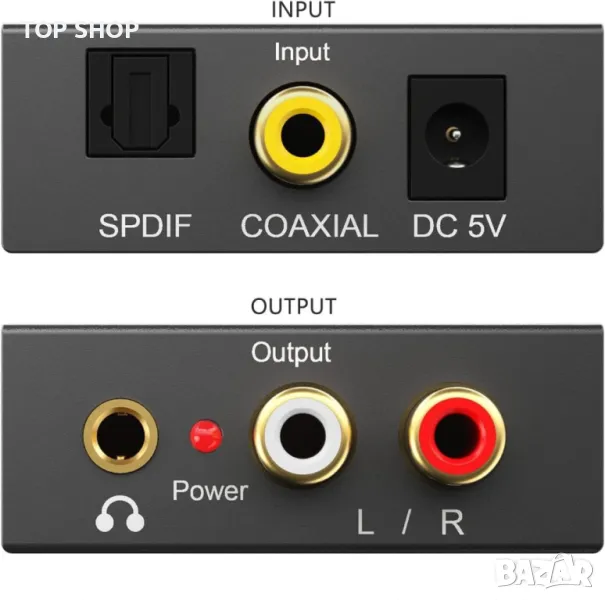 Аудио вход: 1 x Toslink, 1 x RCA (коаксиален); Аудио изход: 2 x RCA (R/ L), 1 x 3,5 мм женски; Захранва се от 5,5 мм захранващ кабел (захранването е включено); Не използвайте други щепсели, могат да се използват само щекери 5V 1A