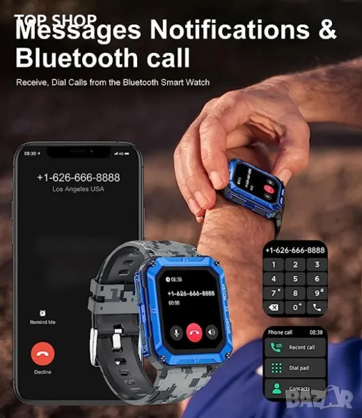 Bluetooth набиране и вграден високоговорител]: Този военен смарт часовник има вграден висококачествен високоговорител и микрофон. С поддръжката на своя превъзходен Bluetooth чипсет, часовникът поддържа Bluetooth за извършване и получаване на повиквания, възпроизвеждане на музика и използване на гласов асистент, освобождавайки ръцете ви от телефона.
