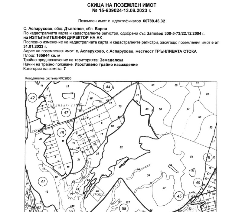 Продава се Поземлен имот с идентификатор 00789.45.32 и площ 165 844 кв. м ,находящ се в землището на с. Аспарухово, м. ТРЪНЛИВАТА СТОКА,Община Дългопол,Област Варна, вид територия Земеделска, категория 7, НТП Изоставено трайно насаждение.Парцела се намира в чашката на язовир Цонево. За имота няма сключен договор за аренда. Продаваме и други земеделски имоти в района. Продажба от собственик, купувачите на този имот нямат ангажимент за заплащане на комисиони.