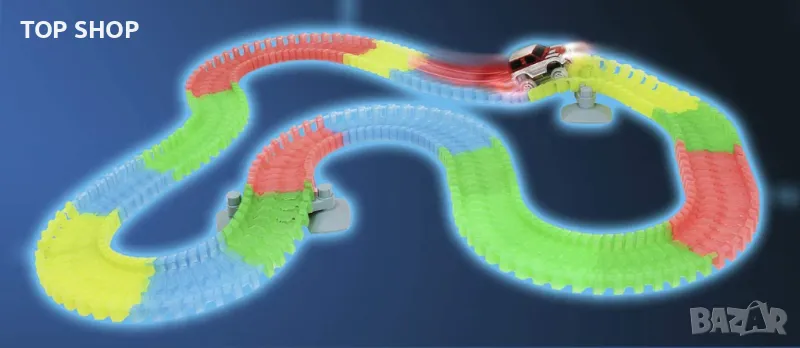 Състезателна писта с коли. Свети в тъмното с различни шарки и форми: огънете го, огънете го и го извийте, за да създадете фантастичен комплект състезания