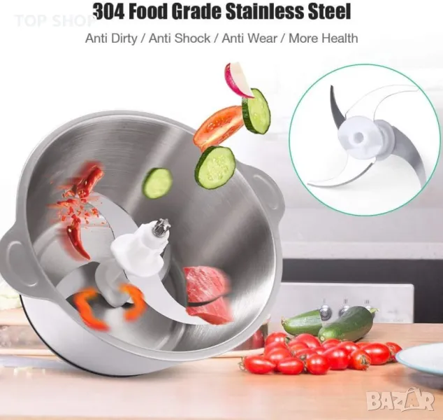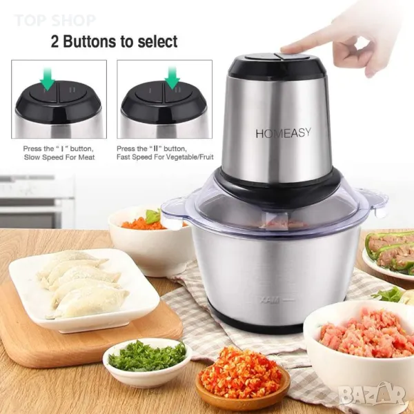 Мултифункционален чопър за храна - Тази мелница за храна е оборудвана с 4 остриета от неръждаема стомана и 2 режима за избор. Можете да нарязвате, смилате различни съставки, като лук, месо, шунка, чесън, лук.