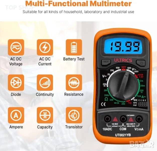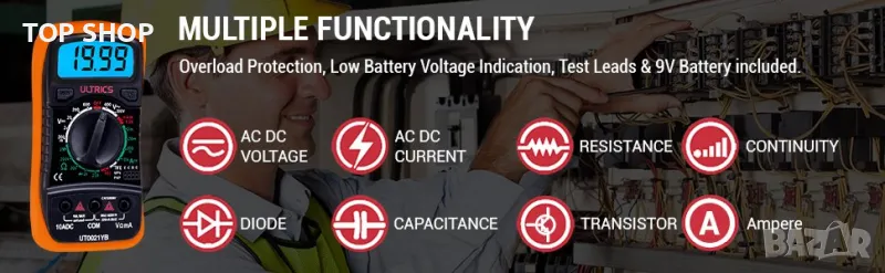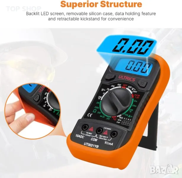 【НАДЕЖДНА РАБОТА】 Този цифров мултитестер включва тестови проводници и 9V батерия, защита от презареждане във всички диапазони, индикатор за изтощена батерия. Двойна изолация със стойка за добър ъгъл на видимост